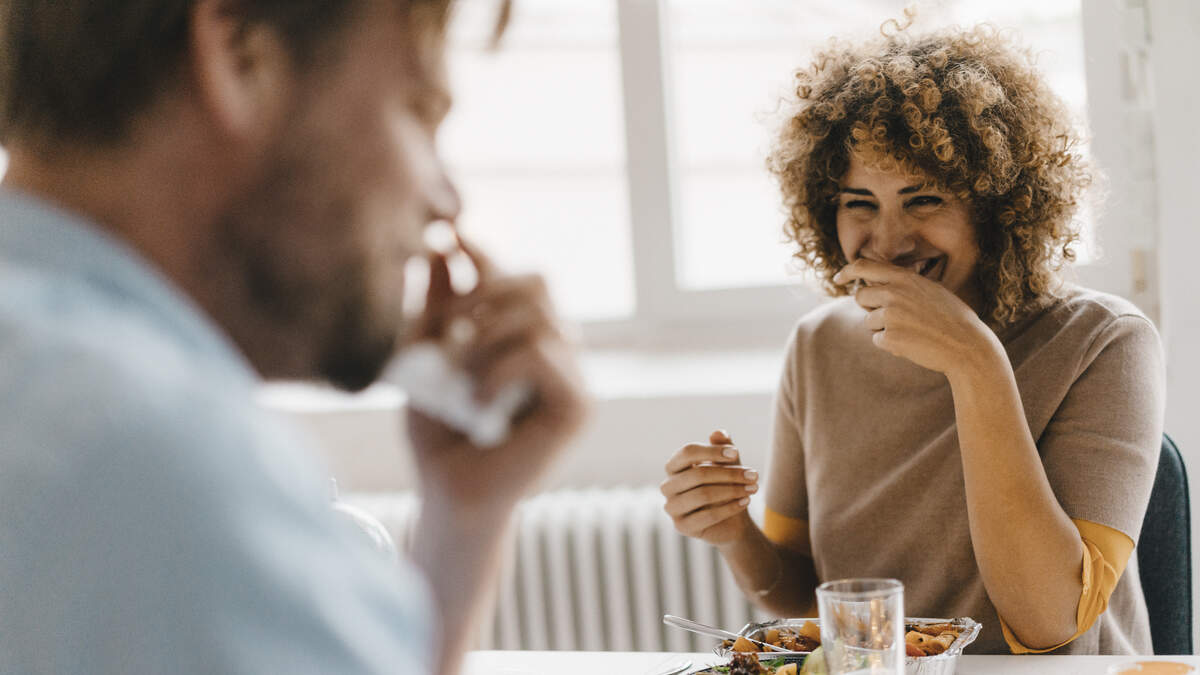Colleagues joking at lunch break, eating healthy food